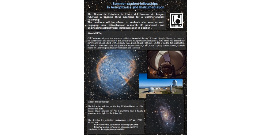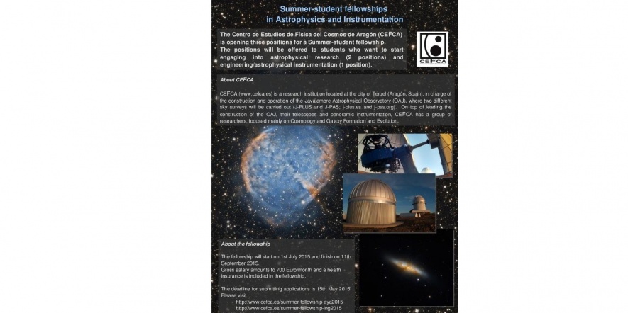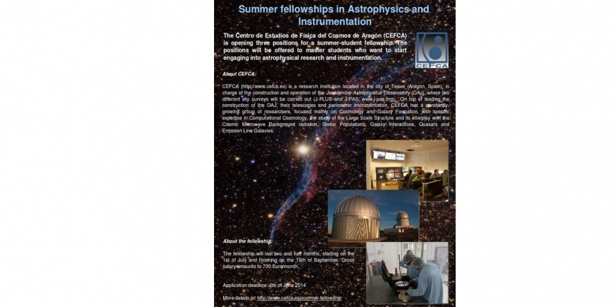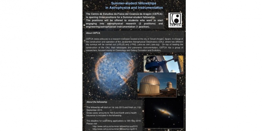 The Centro de Estudios de Física del Cosmos de Aragón (CEFCA) is opening one position for a summer-student fellowship. The position will be offered to students that are coursing a Master or the last year of the Degree who want to start engaging into engineering and astrophysical instrumentation.