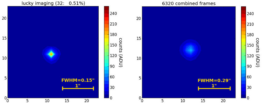 Evaluación de la calidad de imagen intrínseca del telescopio usando técnicas de LI con la cámara de verificación, durante la noche del 2 de diciembre de 2015. El panel izquierdo muestra una FWHM de 0.15” resultado de aplicar técnicas LI para una estrella dada, con tiempos de integración de 10ms por imagen, y habiendo alineando y combinado el 0.5% de las mejores imágenes según su razón de Strehl. El panel derecho muestra la combinación sin alineado previo de todas las imágenes adquiridas durante la prueba, obteniendo una excelente FWHM de 0.29”. El test se llevó a cabo en condiciones de muy buen seeing, con valores de hasta 0.39” durante esa noche. Este resultado demuestra que el sistema JST250+cúpula puede proporcionar imágenes con PSFs menores que el valor de seeing medido por el monitor DIMM.